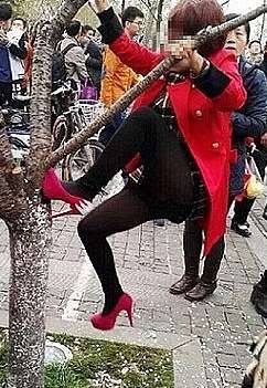 不久前,中國南京雞鳴寺的櫻花盛開之時,一位大媽不顧形象地爬上櫻花樹,並且強行坐在細幼的樹枝上,只為了要拍出夢幻、唯美的櫻花照。